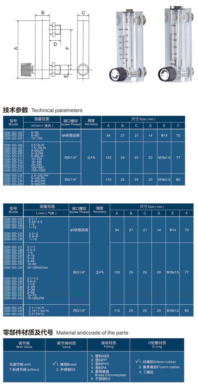 ·连接方式:插管连接;接口螺纹:6快插连接;进/出口径:∅14;测量介质:气体;测量范围:0.6-6L/min;有调节阀;调节阀材质:黄铜 ;接咀材质:黄铜镀铬;浮子材质:不锈钢;O形圈材质:硅胶圈