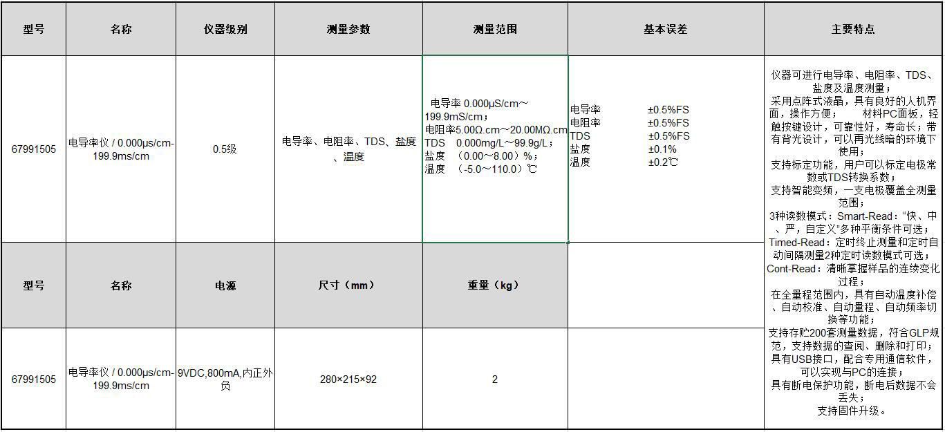 规格:  0.000μS cm~199.9mS cm; 5.00Ω.cm~20.00MΩ.cm 0.000mg L~99.9g L; 制造商型号:  67991505