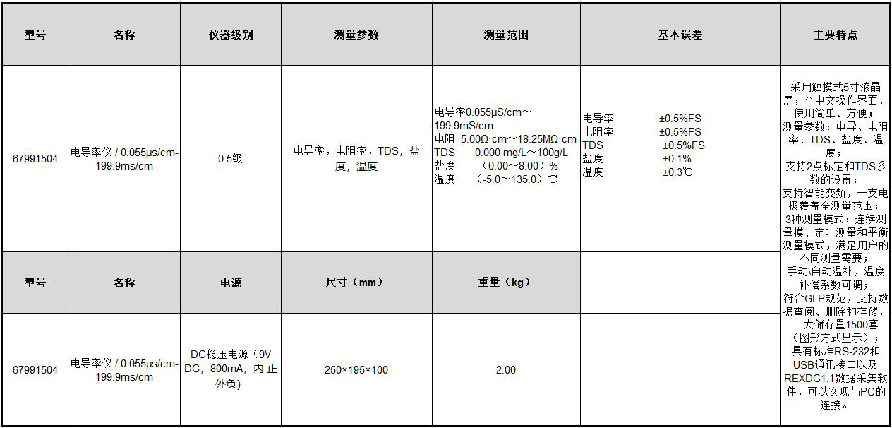 B17544 67991505 67991505 0.5级 电导率、电阻率、TDS、盐度、温度 电导率0.000μS/cm~199.9mS/cm; 电阻率5.00Ω.cm~20.00MΩ.cm TDS0.000mg/L~99.9g/L; 盐度(0.00~8.00)%; 温度(-5.0~110.0)℃ 电导率±0.5%FS 电阻率±0.5%FS TDS±0.5%FS 盐度±0.1% 温度±0.2℃ 9VDC,800mA,内正外负 280×215×92mm 2Kg 21495.12