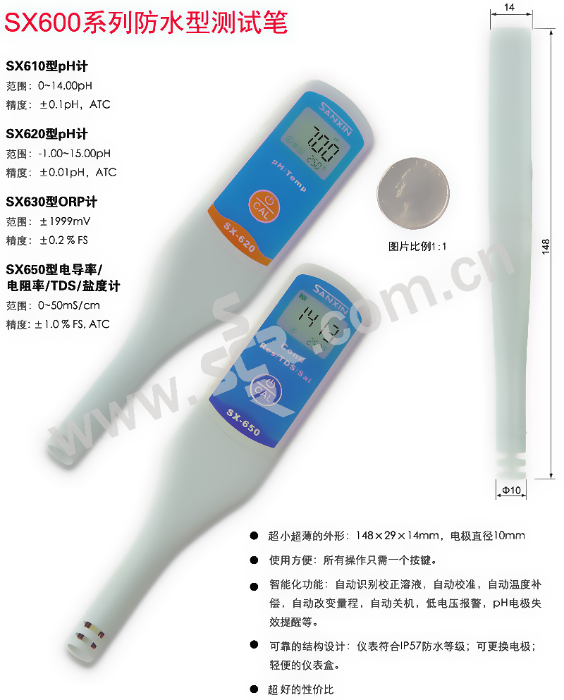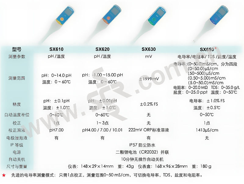 ·同类产品比较:测量范围超大:0~50mS/cm;测量参数多:可切换电导率、TDS、盐度和电阻率,TDS和盐度采用多项式计算,保证全量程的换算精度。·超小超薄的外形:148×29×14mm,电极直径10mm。·超好的功能:自动校正,自动温度补偿,自动改变量程,自动关机,低电压报警等智能化功能。·非常方便的使用:所有操作只需一个按键。·符合IP57防水等级,可更换电极,仪表盒内有校正溶液和备用电池。