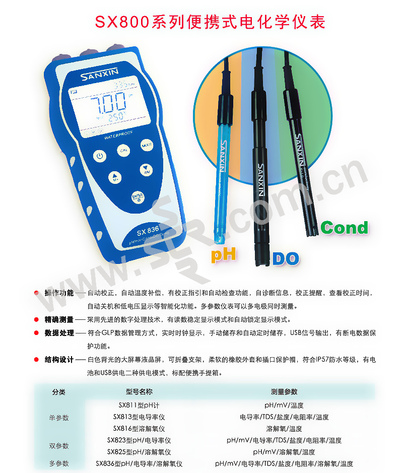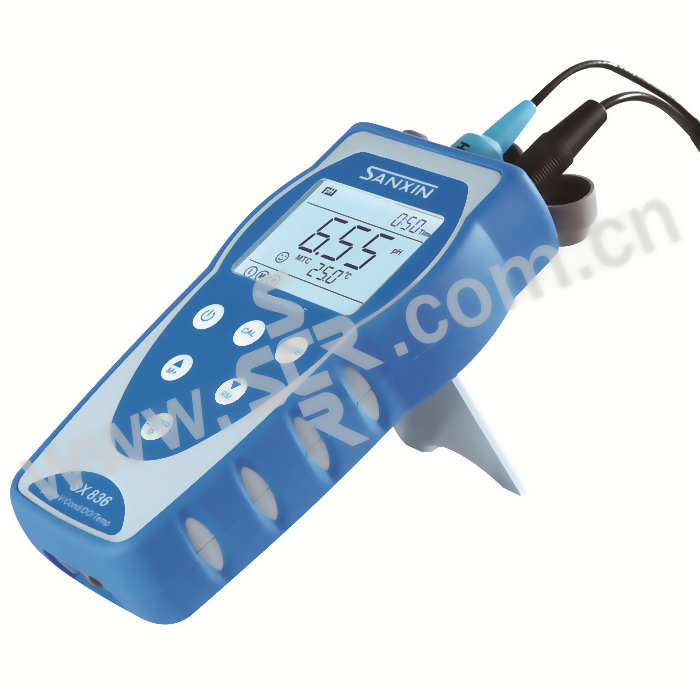 ·有四个校准点可供选择,有校准指引和自动检查功能·可切换电导率、TDS、盐度和电阻率测量模式。TDS测量可调节系数·自动识别8种电导率标准溶液,有二个系列的标准溶液可以选择,有自定义溶液校准·自动切换量程,对小于10μS/cm的纯水和高纯水,自动进行非线性温度补偿,大大提高了高纯水电导率的测量准确度,适合电力、微电子和医药行业的使用·配置校准溶液和手提箱,适合野外和现场使用·符合IP57防水等级