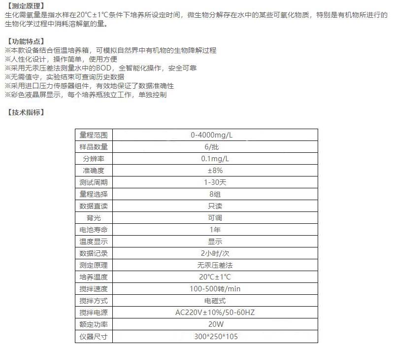 ·本款设备结合恒温培养箱,可模拟自然界中有机物的生物降解过程 ·人性化设计,操作简单,使用方便 ·采用无汞压差法测量水中的BOD,全智能化操作,安全可靠 ·无需值守,实验结束可查询历史数据 ·采用进口压力传感器组件,有效地保证了数据准确性 ·彩色液晶屏显示,每个培养瓶独立工作,单独控制 ·生化需氧量是指水样在20℃±1℃条件下培养所设定时间,微生物分解存在水中的某些可氧化物质,特别是有机物所进行的生物化学过程中消耗溶解氧的量。