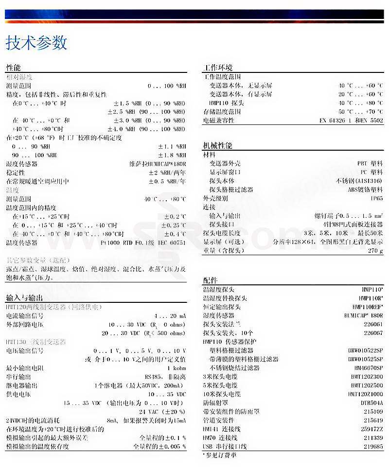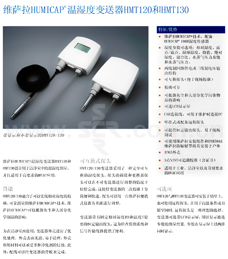 ·维萨拉HUMICAP®技术,配备 HUMICAP® 180R湿度传感器·湿度参数可选项:相对湿度、露 点/霜点、湿球温度、焓值、绝对 湿度、混合比、水蒸气压力及饱 和水蒸气压力。 ·两线制回路供电或三线制电压输 出结构 ·可互换探头(便于现场校准) ·精确可靠 ·可抵御灰尘和大部分化学污染物 品的影响 ·可选LCD显示屏 ·USB连接线,可用于维护时连接PC ·壁挂式或配备远程探头 ·可提供恒定输出探头,易于现场