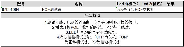 ·测试网线、电话线的通断与交叉等识别哪几根线供电。 ·测试连接POE交换机的网线,区分带电线对。 ·LED灯直观的显示测试结果。 ·有快慢档测试功能,“OFF”为关机,“ON” 为正常测试档,“S”为慢速测试档