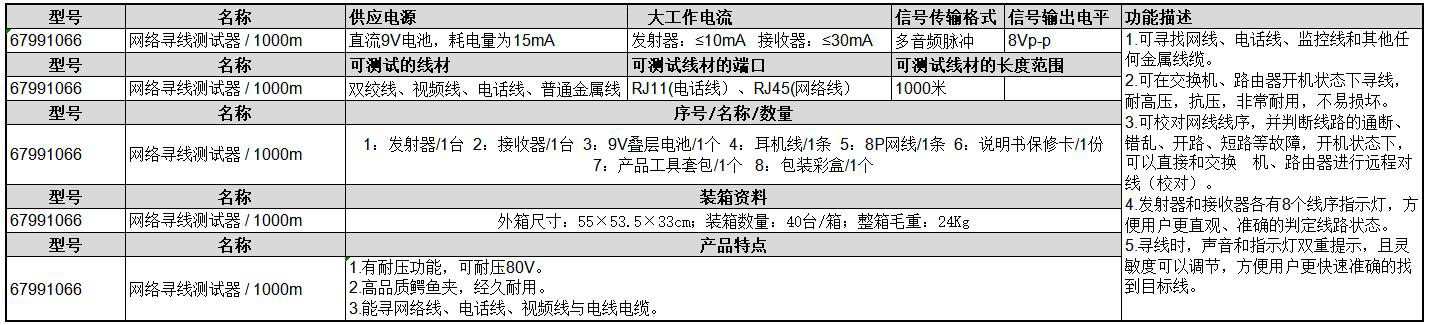 ·有耐压功能,可耐压80V ·高品质鳄鱼夹,经久耐用 ·能寻网络线、电话线、视频线与电线电缆 ·序号/名称/数量:1:发射器/1台 2:接收器/1台 3:9V叠层电池/1个 4:耳机线/1条 5:8P网线/1条 6:说明书保修卡/1份 7:产品工具套包/1个 8:包装彩盒/1个 ·可寻找网线、电话线、监控线和其他任何金属线缆。 ·可在交换机、路由器开机状态下寻线,耐高压,抗压,非常耐用,不易损坏。 ·可校对网线线序,并判断线路的通断、错乱、开路、短路等故障,开机状态下,可以直接和交换 机、路由器进行远程对线(校对)。 ·发射器和接收器各有8个线序指示灯,方便用户更直观、准确的判定线路状态。 ·寻线时,声音和指示灯双重提示,且灵敏度可以调节,方便用户更快速准确的找到目标线。