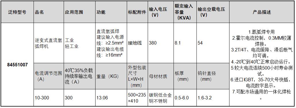 ·1.氩弧焊专用 ·2.霍尔电流控制,0.3MM较薄焊接。 ·3.2T/4T、电流缓降、滞后断气均可调。 ·4.-20℃到40℃正常启动运行。 ·5.较大电流连续500小时寿命测试。 ·6.进口IGBT,35-70大号快插,电流数字显示。 ·7.可配市场通用的一体化焊枪。 ·直流氩弧焊 ·建议输入电源线:≥2.5mm² ·建议输出电缆线:≥