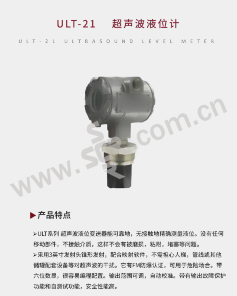 ·ULT系列 超声波液位变送器能可靠地,无接触地精确测量液位。·没有任何移动部件,不接触介质,这样不会有被磨损,粘附,堵塞等问题。·采用3英寸发射头锥形发射,配合映射软件,不需担心人梯,管线或其他储罐配套设备等对超声波的干扰。·它有FM防爆认证,可用于危险场合。·带六位数显,很容易编程配置。输出范围可调,自动校准。·带有输出故障保护功能和自测试功能,安全性能高。