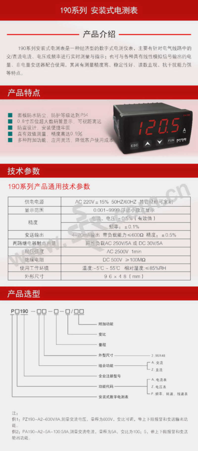 NARUN/纳宇电气 190(DS)系列LCD安装式电测表 PA190-A2-5A 5A 1台