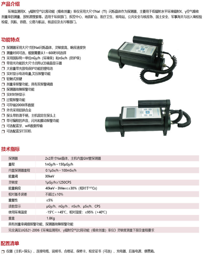 ·探测器采用大尺寸的Nal闪烁晶体,灵敏度高,响应速度快