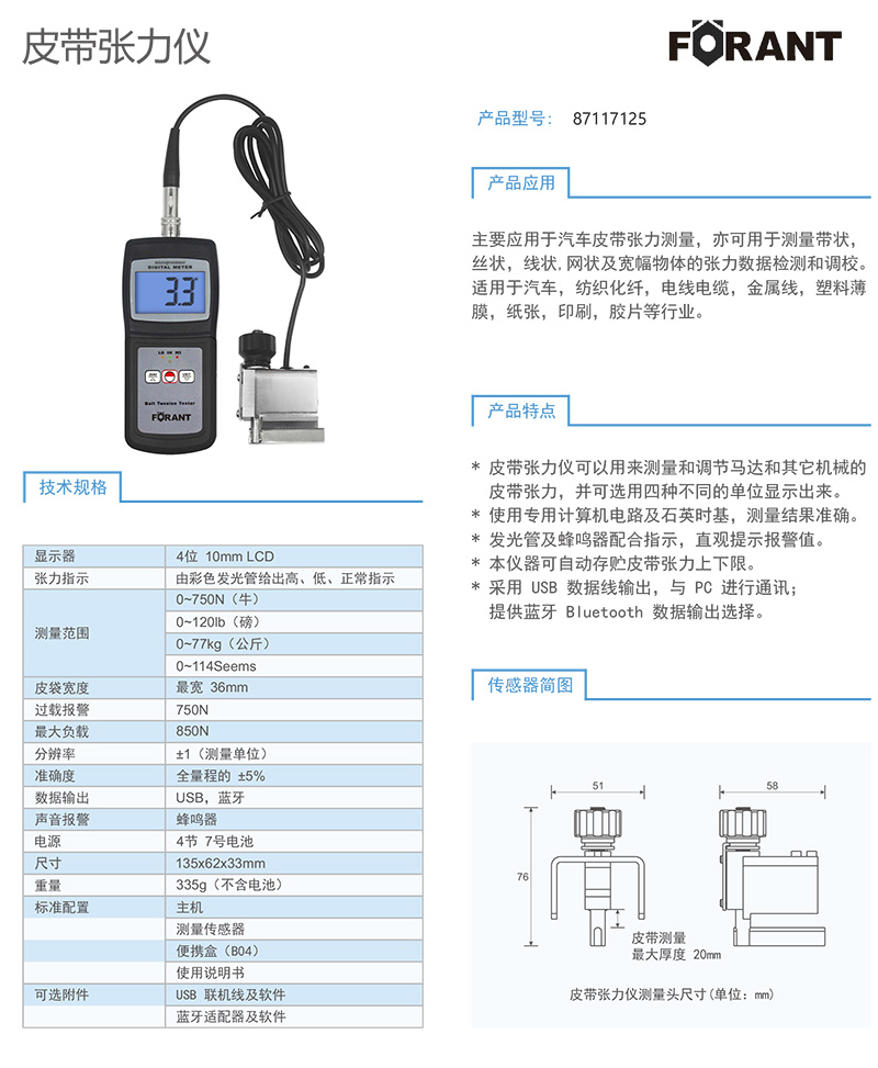 * 皮带张力仪可以用来测量和调节马达和其它机械的皮带张力,并可选用四种不同的单位显示出来。 * 它使用了专用微型计算机电路及石英时基,使测量结果更加准确。 * 在张力仪的测量和调节期间,皮带的张力实时显示在仪器上,同时有指示灯和不同的声音给出张力是否在设定值以内或以外, 这用户调节皮带张力时,提供了方便,没有必要时刻盯着仪器的显示值。 * 本仪器可自动存贮皮带张力上下限,测量单位以及校正结果,即使关机或取出电池,数据也不会丢失。 * 采用“USB 数据线输出”和"RS-232数据线输出"与 PC 进行通讯。 * 提供蓝牙 Bluetooth 数据输出选择。