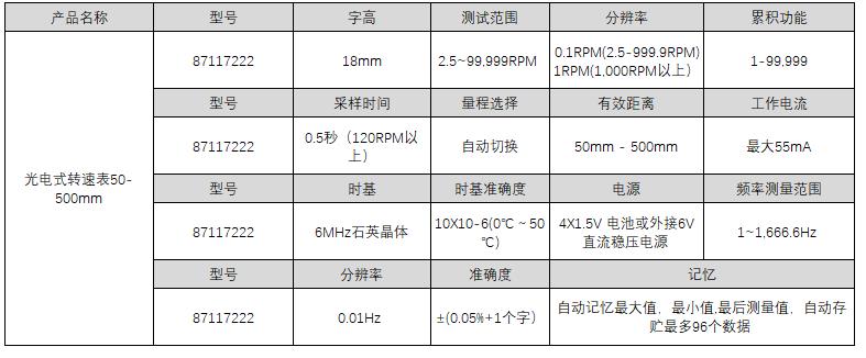 A39431 87117222 2.5~99,999RPM 0.1RPM(2.5-999.9RPM)1RPM(1,000RPM以上) 18mm 1-99,999 ±(0.05%+1个字) 1~1,666.6Hz 0.01Hz 0.5秒(120RPM以上) 自动切换 50mm - 500mm 较大55mA 自动记忆较大值,较大值,较后测量值,自动存贮较多96个数据 6MHz石英晶体 10×10-6(0℃~50℃) 4×1.5V 电池或外接6V直流稳压电源 607.00