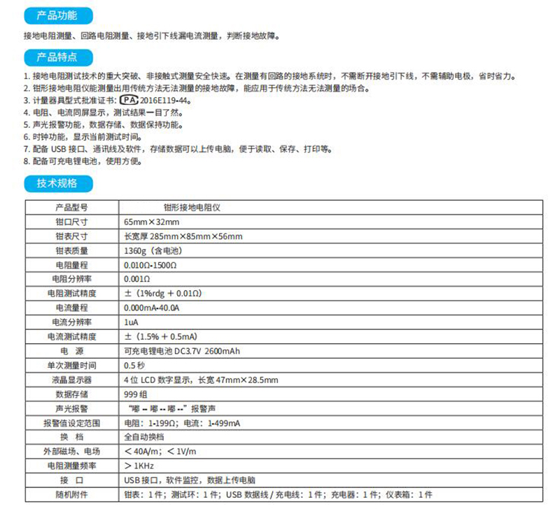 ·接地电阻测量、回路电阻测量、接地引下线漏电流测量,判断接地故障。 ·非接触式测量安全快速,在测量有回路的接地系统时,不需断开接地引下线,不需辅助电极,省时省力。 ·钳形接地电阻仪能测量出用传统方法无法测量的接地故障,能应用于传统方法无法测量的场合。 ·声光报警功能,数据存储、数据保持功能。