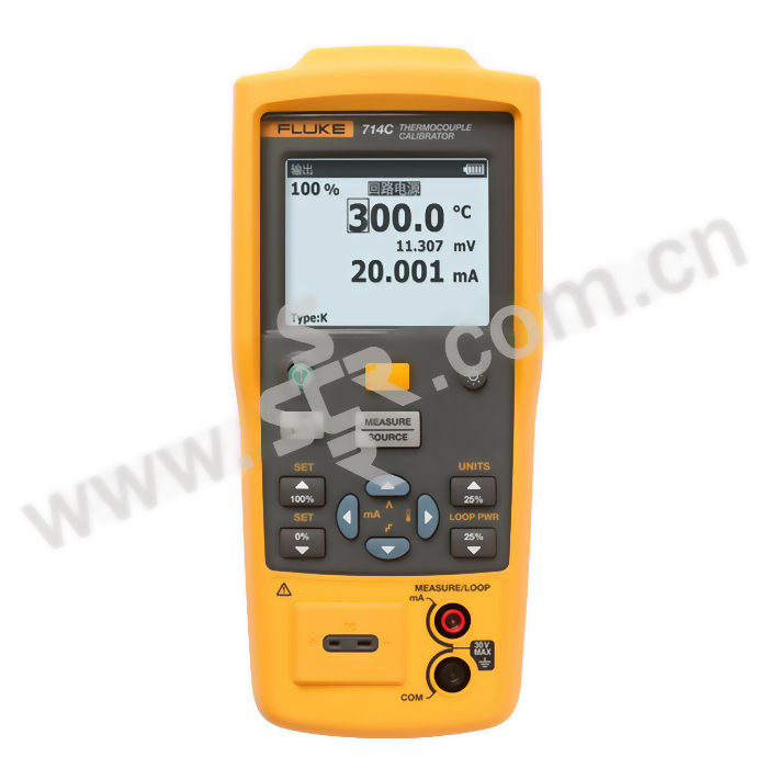 ·714C能够测量和模拟(17)种不同的热电偶以及毫伏·在输出温度信号源的同时测量4至20mA信号·可配置0%和100%源设置,用于快速25%线性检验·线性渐变和基于0%和100%设置的25%步进自动渐变·双路输入和背光显示,便于判读测量结果·自动记忆断电时的设置,便于通电时重新开始测试·1年期和2年期技术指标与可追踪校准报告·24V伏特的回路电源