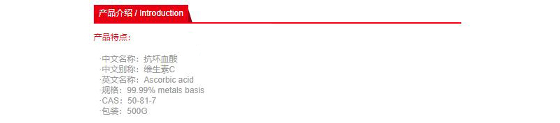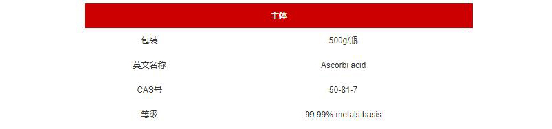 ·产品货号:A103534-500g ·中文名称:抗坏血酸 ·中文别称:维生素C ·英文名称:Ascorbic acid ·规格:99.99% metals basis ·CAS:50-81-7 ·包装:500G