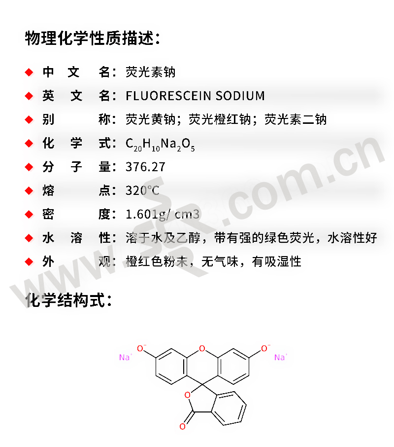 ·中文名称:荧光素钠·英文名称:Fluoresceinsodium·分子式:C20H10Na2O5·分子量:376。27·性状:橙红色粉末。无气味。有吸湿性。易溶于水、溶液呈黄红色、并带很强的黄绿色荧光、酸化后消失、中和或碱化后又出现、微溶于乙醇。最大吸收波长(水)493。5nm。半数致死量(大鼠、经口)6721mG/kG。