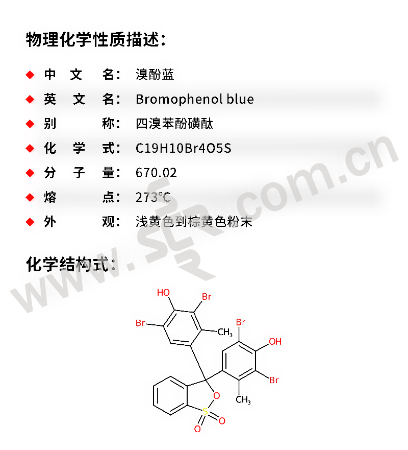 ·中文名称:溴酚蓝·英文名称:Bromophenolblue·分子式:C19H10Br4O5S·分子量:669。96·性状:浅黄色到棕黄色粉末。易溶于氢氧化钠溶液、溶于甲醇、乙醇和苯、微溶于水(约0。4G/100ml)。熔点279℃(分解)。最大吸收波长422nm。