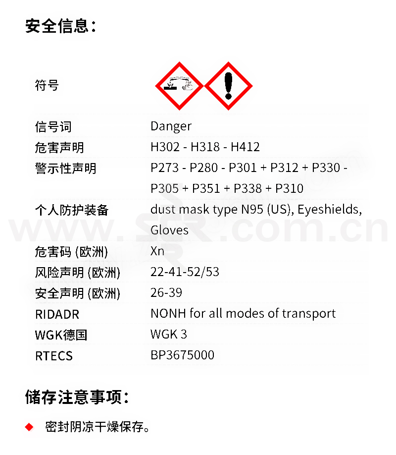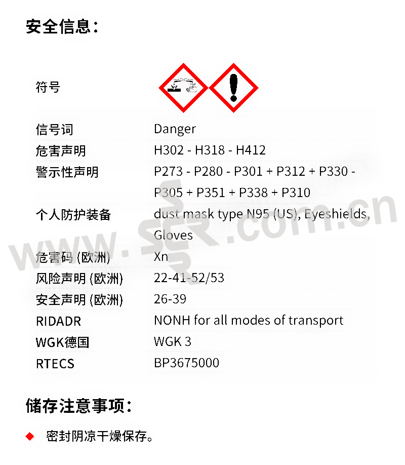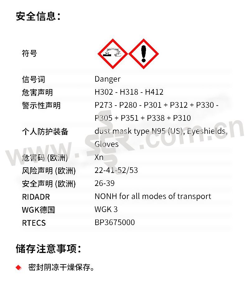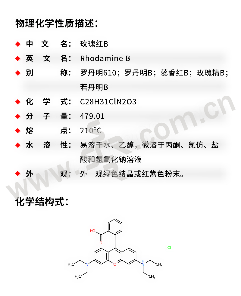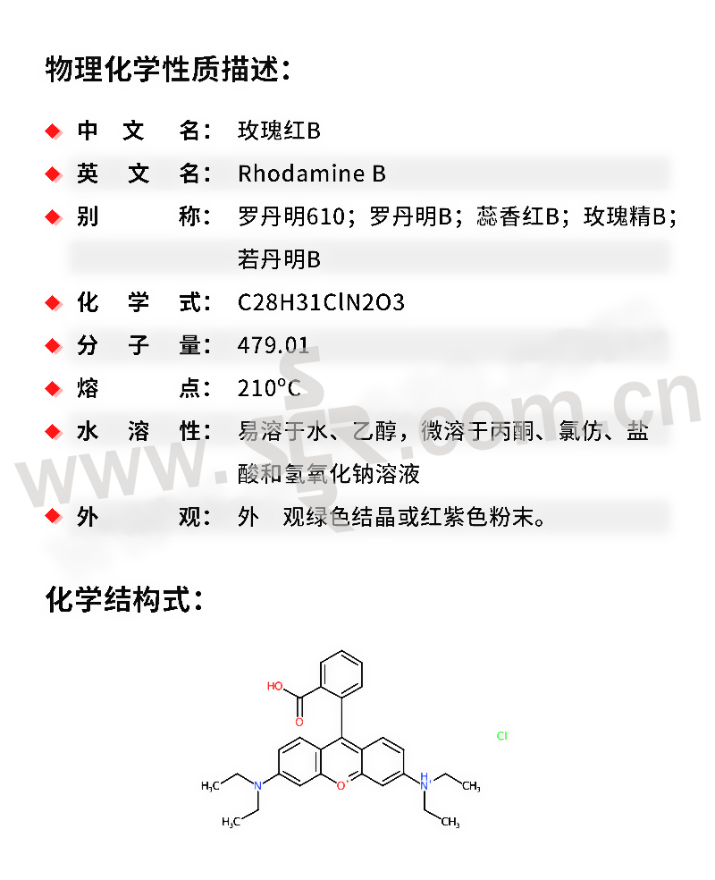 ·中文名称:玫瑰红B·英文名称:RhodamineB·分子式:C28H31ClN2O3·分子量:479。01·性状:绿色结晶或红紫色粉末。易溶于水、乙醇、微溶于丙酮、氯仿、盐酸和氢氧化钠溶液。水溶液为蓝红色、稀释后有强烈荧光、醇溶液为红色荧光。最大吸收波长552nm。最大荧光波长610nm。激光峰值波长610nm。调谐范围578~610nm。中等毒、半数致死量(大鼠、经口)500mG/kG。
