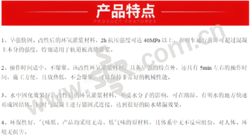 ·早强快固,改性后的环氧灌浆材料,2h抗压强度可达40MPa以上,在列车通行前即可超过混凝土本身的强度,特别适用于轨道板离缝灌浆。·2、操作时间适中,不爆聚。该改性环氧灌浆材料·3、水中固化效果好。改性后的环氧灌浆材料·4、环保性好,气味低。产品均采用无毒、低气味的原材料,且体系中无不反应组份,对人体、环境无损害