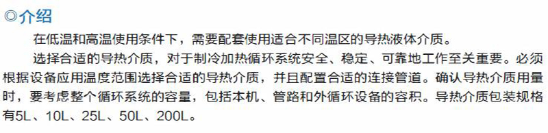 ·选择合适的导热介质,对于制冷加热循环系统安全、稳定、可靠地工作至关重要。必须根据设备应用温度范围选择合适的导热介质,并且配置合适的连接管道。确认导热介质用量时,要考虑整个循环系统的容量,包括本机、管路和外循环设备的容积。导热介质包装规格有5L、10L、25L、50L、200L。