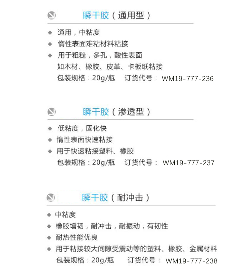 ·低粘度,固化快 ·惰性表面快速粘接 ·用于快速粘接塑料、橡胶