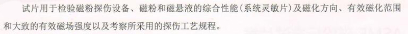 ·试片用于检验磁粉探伤设备、磁粉和磁悬液的综合性能(系统灵敏片)及磁化方向、有效磁化范围和大致的有效磁场强度以及考察所采用的探伤工艺规程。