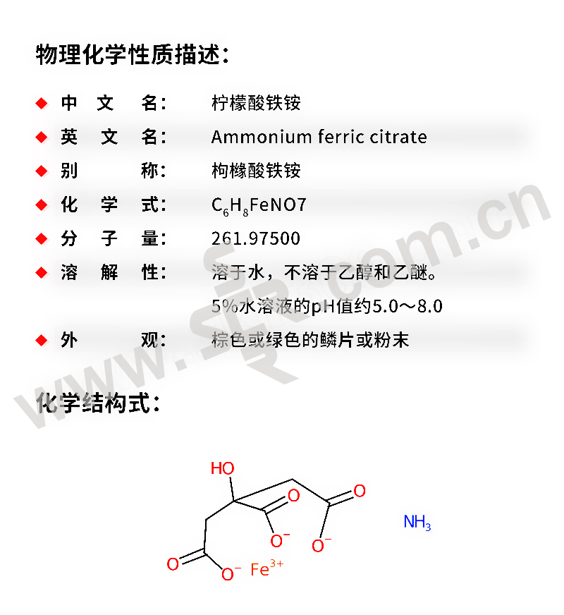 ﹒中文名称:柠檬酸铁铵﹒英文名称:Ammoniumferriccitrate﹒分子式:C12H22FeN3O14﹒分子量:488。16﹒性状:红棕色颗粒或石榴红透明鳞片状或粉末。无气味。微有铁味。固体易潮解。露光时比棕色柠檬酸铁铵更易还原为亚铁盐。易溶于水、几乎不溶于乙醇。半数致死量(小鼠、经口)1000mG/kG。有刺激性。