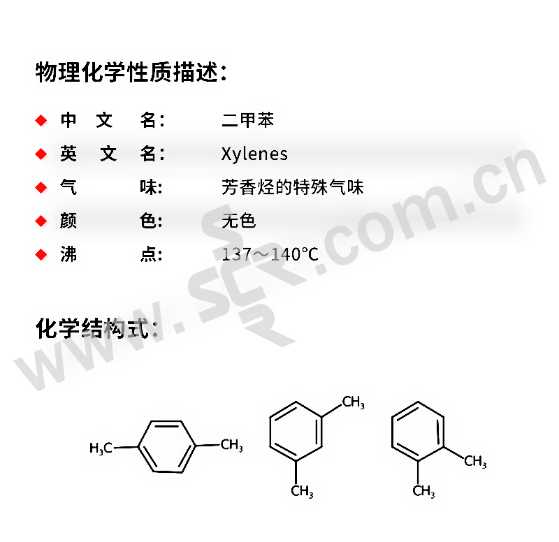 ﹒中文名称:二甲苯﹒英文名称:Xylene﹒分子式:C8H10﹒分子量:106。17﹒性状:无色透明液体。有芳香烃的特殊气味。系由45%~70%的间二甲苯、15%~25%的对二甲苯和10%~15%邻二甲苯三种异构体所组成的混合物。易流动。能与无水乙醇、乙醚和其他许多有机溶剂混溶、几乎不溶于水。相对密度约0。86。沸点137~140℃。折光率(n20D)1。4970。闪点29℃。