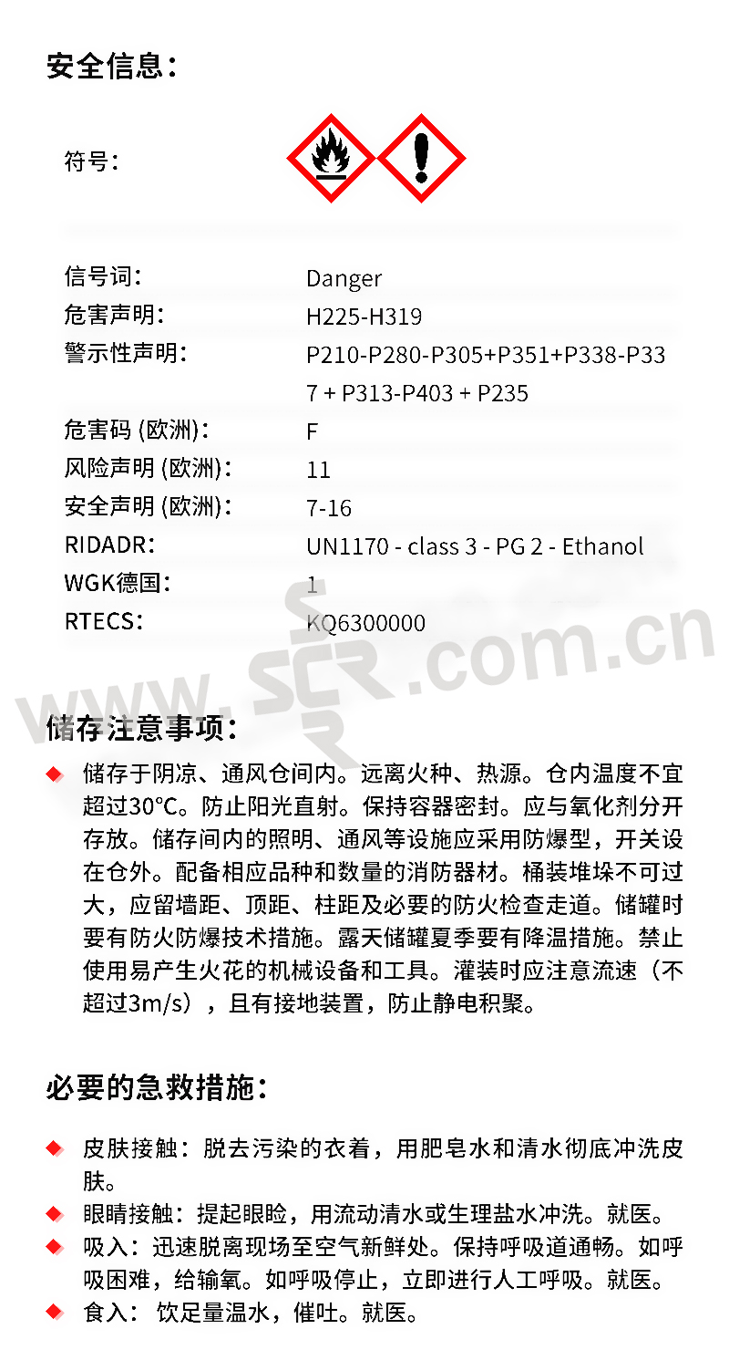 ·氯化钠·英文名称:75%Etanol·分子式:C2H6O·分子量:46.07·性状:无色澄清液体。有愉快的气味和灼烧味,易流动。很容易从空气中吸收水分,能与水和氯仿、乙醚等多种有机溶剂混溶。能与水形成共沸混合物(含水4.43%),共沸点78.15℃。相对密度(d204)0.789。熔点-114.1℃。沸点78.5℃。折光率(n20D)1.361。闪点(闭杯)13℃。易燃。