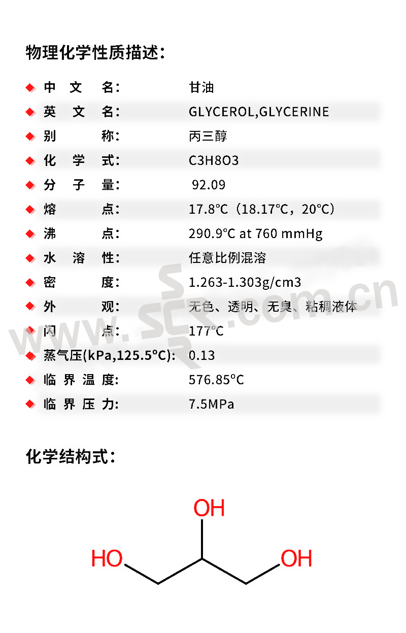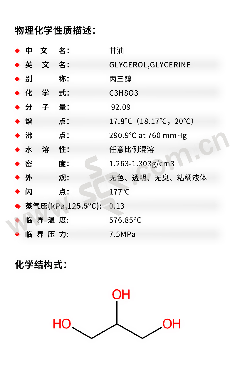 ·中文名称:甘油·英文名称:Glycerol别名甘油:1、2、3-丙三醇、丙三醇·分子式:C3H8O3·分子量:92。09·性状:无色澄明黏稠液体。无臭。有暖甜味。能从空气中吸收潮气、也能吸收硫化氢、氰化氢和二氧化硫。对石蕊呈中性。长期放在0℃的低温处、能形成熔点为17。8℃有光泽的斜方晶体。遇强氧化剂如三氧化铬、氯酸钾、高锰酸钾能引起燃烧和爆炸。能与水、乙醇任意混溶、1份本品能溶于11份乙酸