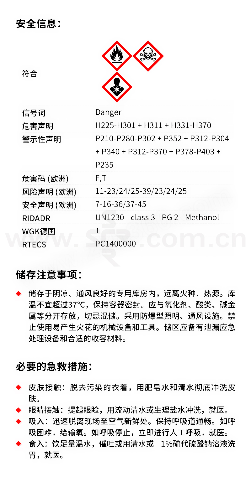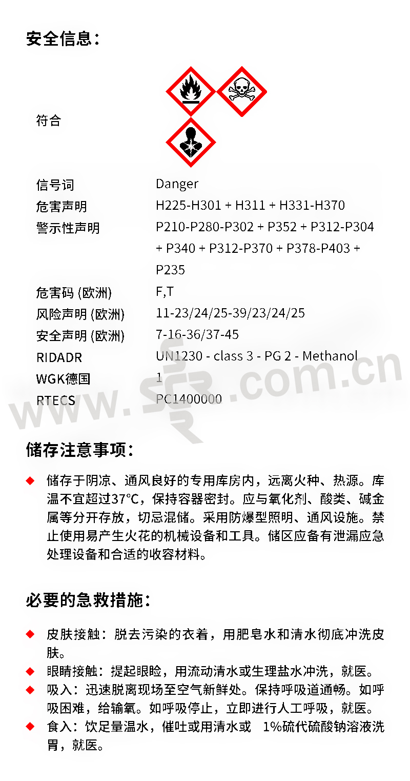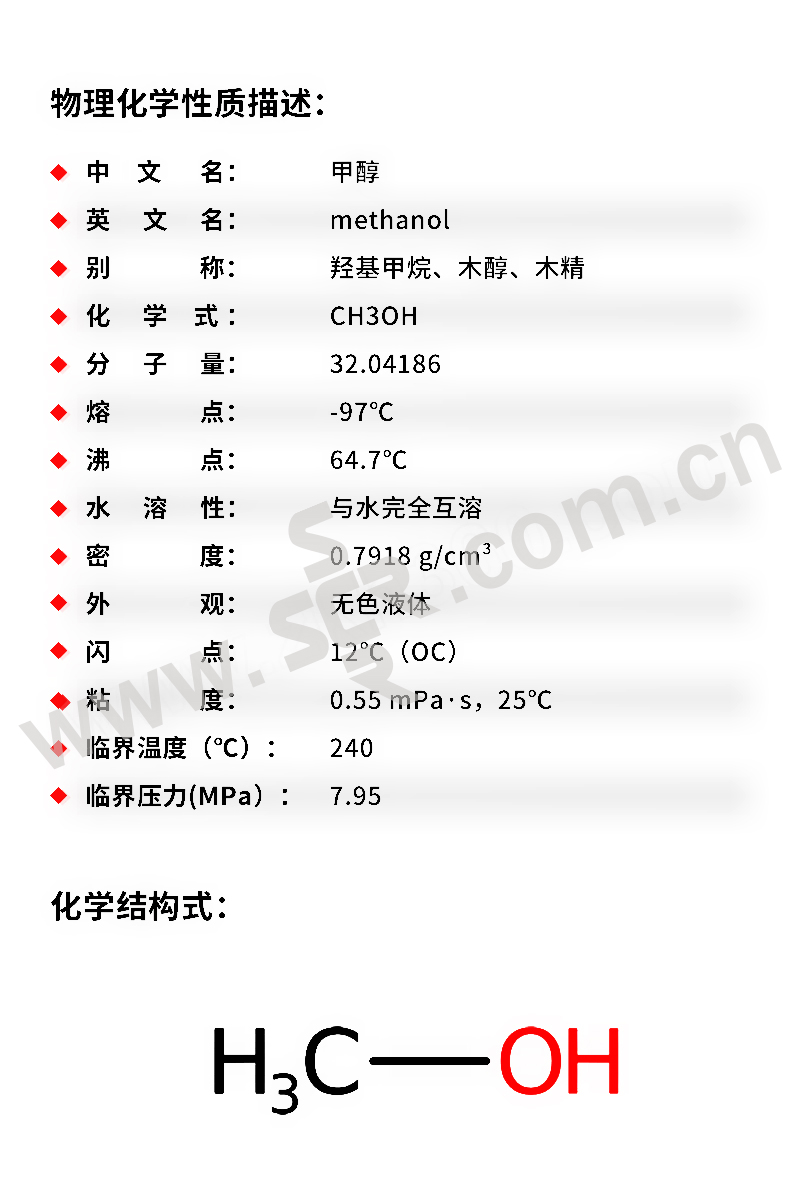 ·中文名称:甲醇·英文名称:Methanol·分子式:CH4O·分子量:32。04·性状:无色澄清液体。微有乙醇样气味。易挥发。易流动。燃烧时无烟有蓝色火焰。能与多种化合物形成共沸混合物。能与水、乙醇、乙醚、苯、酮类和其他有机溶剂混溶。溶解性能优于乙醇、能溶解多种无机盐类、如碘化钠、氯化钙、硝酸铵、硫酸铜、硝酸银、氯化铵和氯化钠等。相对密度(d204)