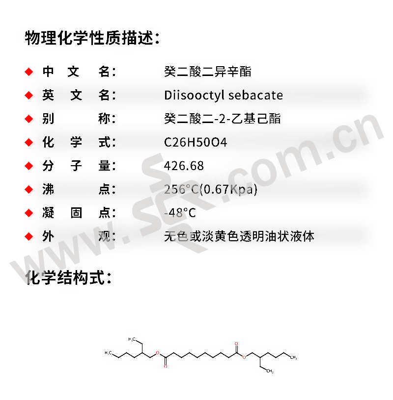·中文名称:癸二酸二异辛酯·英文名称:Dioctylsebacate·分子式:C26H50O4·分子量:426。67·性状:无色或微黄色透明粘稠液体。溶于乙醇、乙醚、丙酮和氯仿、不溶于水。相对密度(d2525)0。9119。熔点-55℃。沸点248℃(0。53kPa)。折光率(n25D)1。4496。闪点(开杯)210℃。粘度0。2Pa·s(20℃)。低毒、半数致死量(大鼠、经口)1280mg/kg。