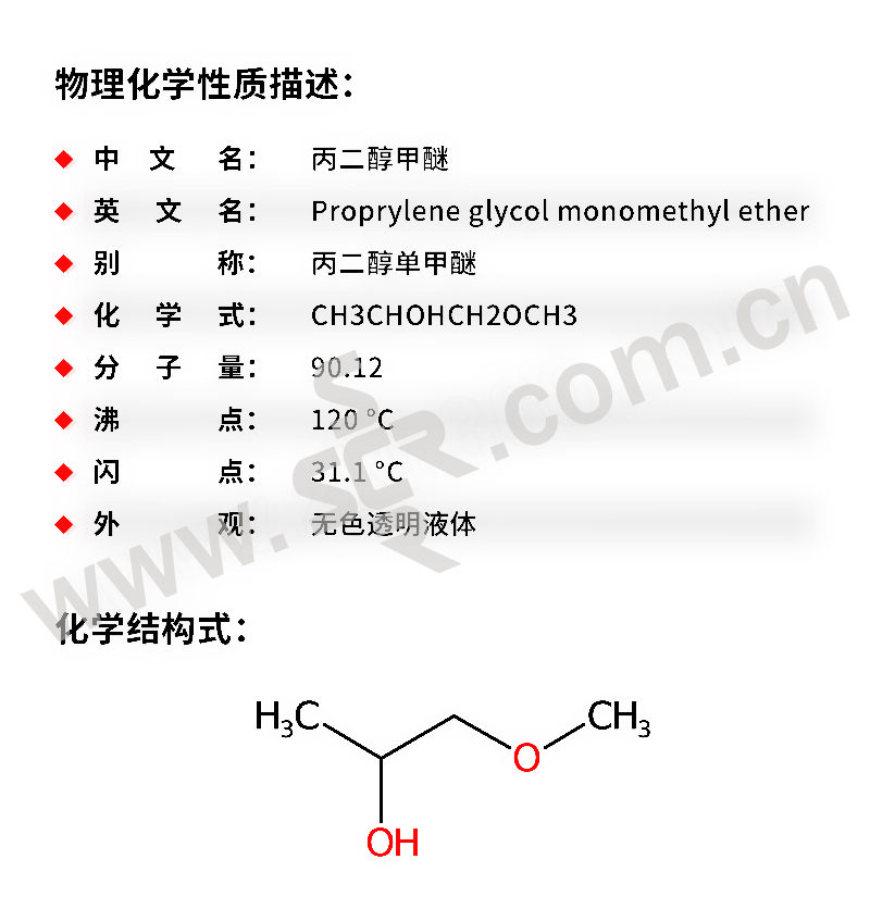 ﹒中文名称:丙二醇甲醚﹒英文名称:Propyleneglycolmethylether﹒分子式:C4H10O2﹒分子量:90。12﹒性状:无色透明液体。m。p。-97℃、b。p。118~119℃、n20D1。4030、相对密度0。9220、f。p。33℃、不溶于水、溶于醚、氯仿等有机溶剂。
