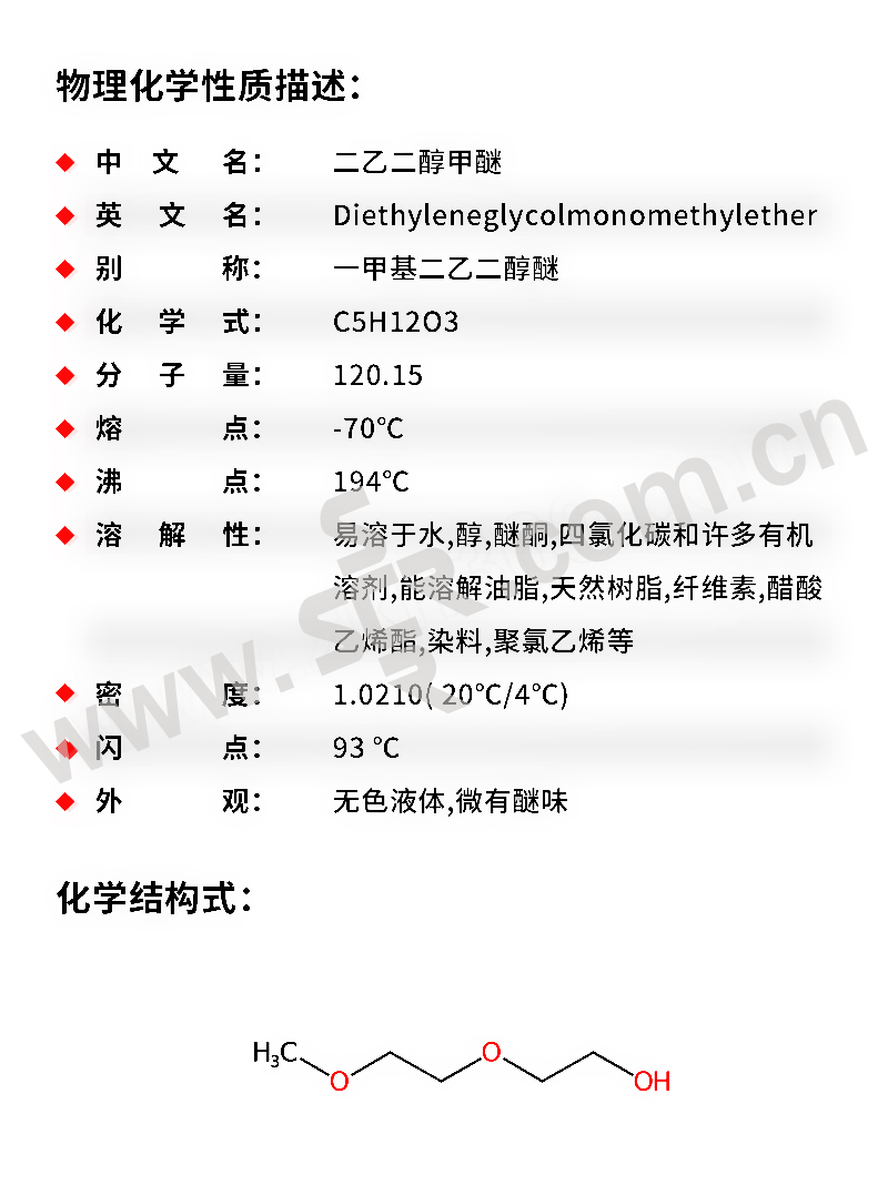 ﹒中文名称:二乙二醇甲醚﹒英文名称:2-(2-Methoxyethoxy)ethanol﹒分子式:C5H12O3﹒分子量:120。15﹒性状:无色液体。有芳香气味。有吸湿性。能与水、乙醇、甘油、乙醚、丙酮、二甲基乙酰胺等混溶。相对密度(d204)1。035。熔点<-84℃。沸点193℃。折光率(n27D)1。4264。闪点93℃。半数致死量(大鼠、经口)9。21g/kg。有刺激性。