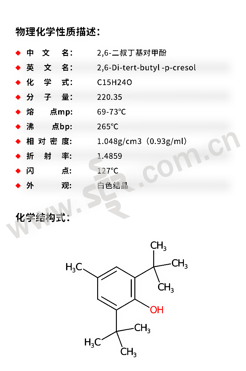 ·中文名称:2、6-二叔丁基对甲酚·英文名称:2、6-Di-tert-butyl-4-methylphenol·分子式:C15H24O·分子量:220.35·性状:不溶于水、能溶于醚、丙酮、苯和氯仿,有刺激性。