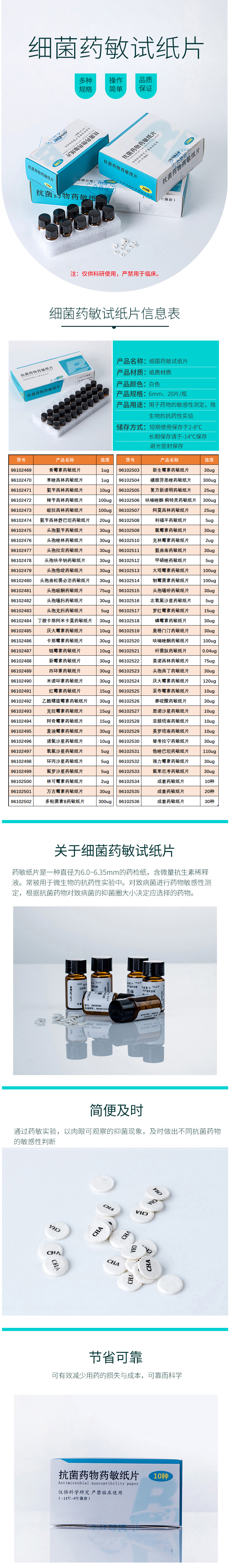 ·用于体外细菌敏感性检测 ·产品仅供生化实验使用,不可用于临床 ·规格:20片/瓶