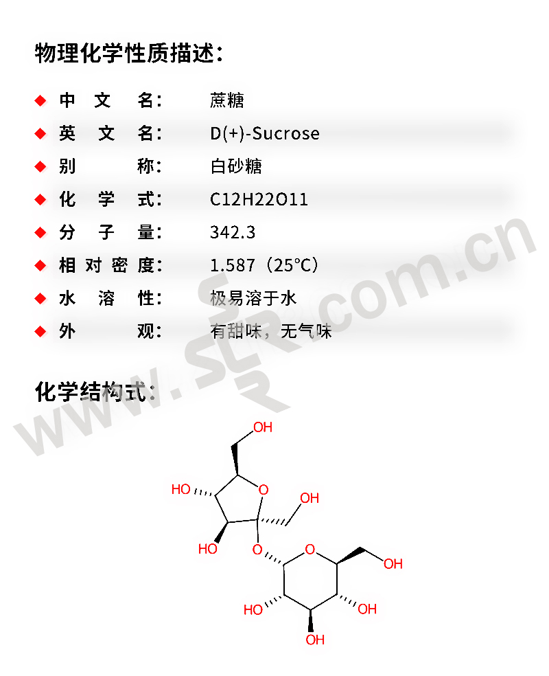 ﹒中文名称:蔗糖﹒英文名称:Sucrose﹒分子式:C12H22O11﹒分子量:342。29﹒性状:无色单斜楔形结晶或白色颗粒或结晶性粉末。味甜。有吸湿性。在空气中稳定。不能还原斐林氏溶液。不形成脎。无变旋旋光性。在160~186℃分解。能被稀酸转化酶水解成葡萄糖和果糖。1g溶于0。5ml水、170ml乙醇、约100ml甲醇、微溶于甘油、吡啶。相对密度(d254)1。587。
