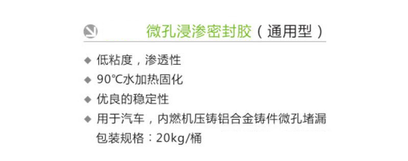 ·低粘度,渗透性 ·90℃水加热固化 ·优良的稳定性 ·用于汽车,内燃机压铸铝合金铸件微孔堵漏