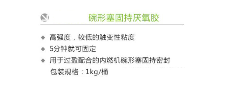 ·高强度,较低的触变性粘度 ·5分钟就可固定 ·用于过盈配合的内燃机碗形塞固持密封包装规格:
