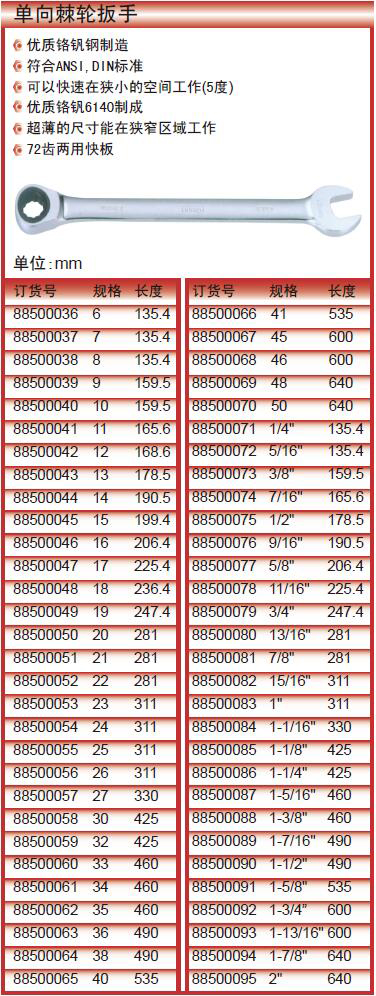 ·优质铬钒钢制造 ·符合ANSI,DIN标准 ·可以快速在狭小的空间工作(5度) ·优质铬钒6140制成 ·超薄的尺寸能在狭窄区域工作 ·72齿两用快板
