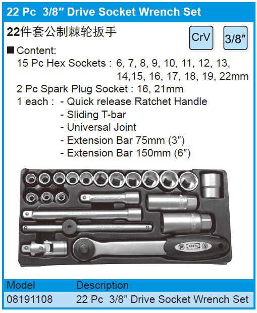 15个六角螺丝插座: 6 7 8 9 10 11 12 13 14 15 16 17 18 19 22mm 2 Pc火花塞插座: 16 21mm 每个1个: 快速释放棘轮手柄 -滑动T形杆 -万向节 -延长杆75mm(3“) -延长杆150mm(6“)