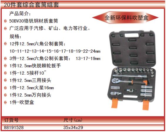 ·12件12.5mm六角公制套筒: ·10-11-12-13-14-15-16-17-18-19-22-24mm ·3件-12.5mm六角公制长套筒:13-17-19mm ·1件12.5mm快脱棘轮扳手 ·1件-12.5接杆10" ·1件12.5mm三用接头 ·1件-12.5mm火星16mm 1件12.5mm万向接头 1件-吹塑盒