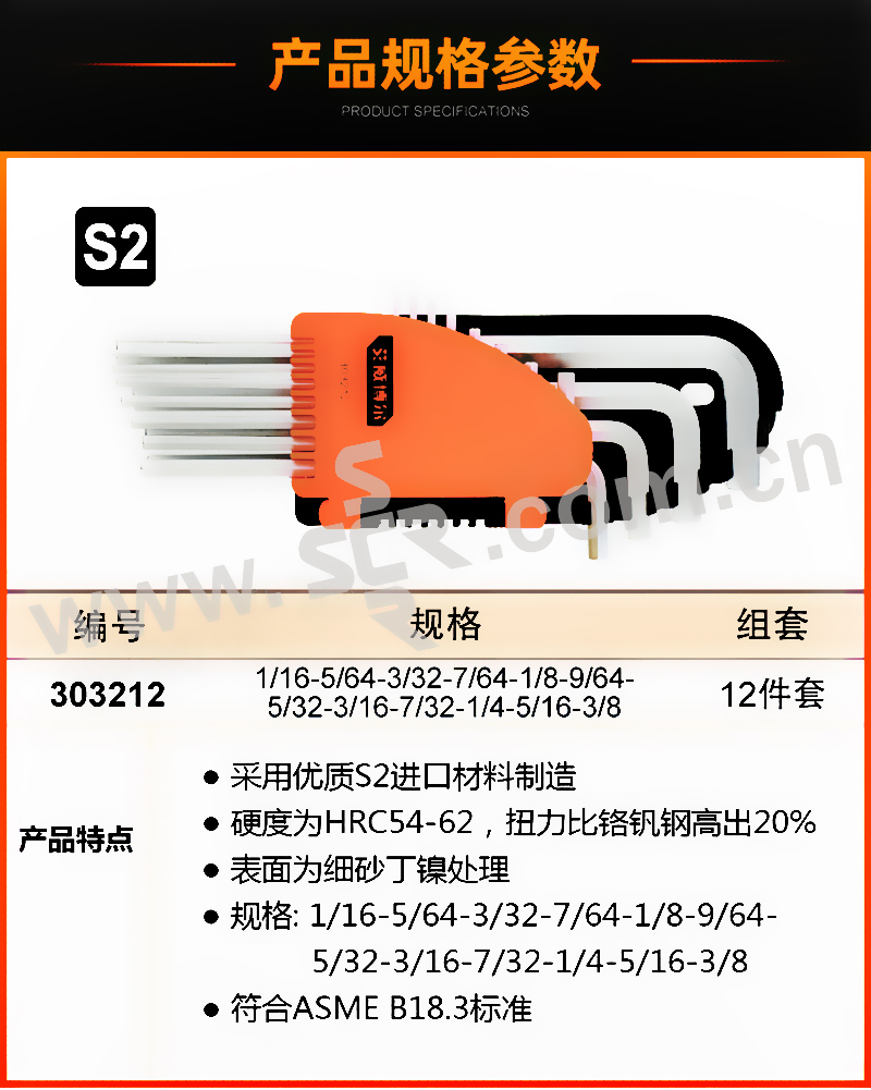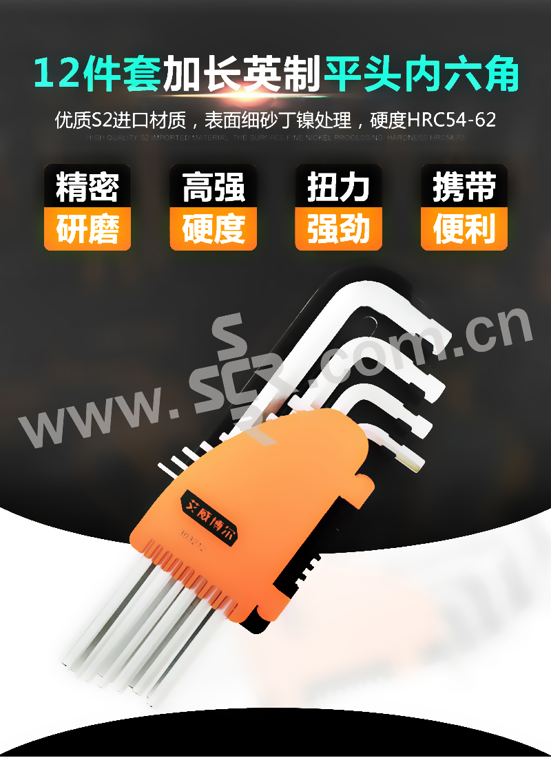 ·采用优质S2进口材料制造·硬度为HRC54-62,扭力比铬钒钢高出20%·表面为细砂丁镍处理·规格:1/16-5/64-3/32-7/64-1/8-9/64-5/32-3/16-7/32-1/4-5/16-3/8