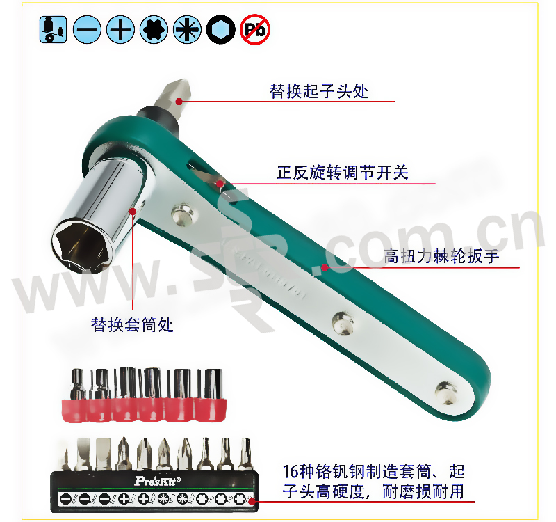 ·集合常用16种套筒和起子头, 并以铬钒钢材制造