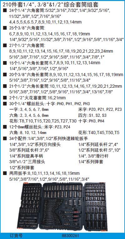 规格:  210件套3/8"1/4"1/2"综合套筒组套 制造商型号:  88300261