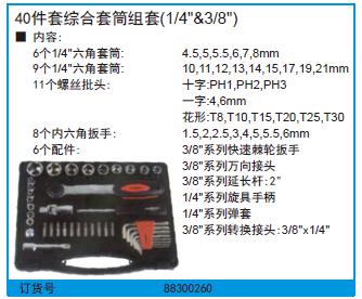 规格:  40件套3/8"1/4"综合套筒组套 制造商型号:  88300260