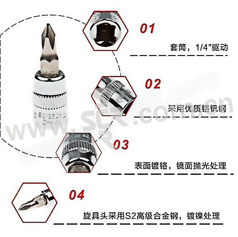 ·旋具头:S2高级合金钢,镀镍处理。