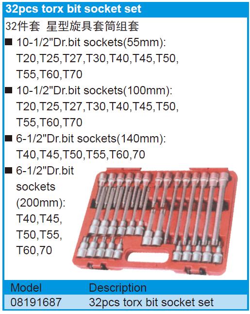 10-1/2“ Dr.bit套筒(55mm) T20 T25 T27 T30 T40 T45 T50 T55 T60 T70 10-1 / 2“ Dr.bit套筒((100mm) T20 T25 T27 T30 T40 T45 T50 T55 T60 T70 6-1 / 2“ Dr.bit套筒(140mm) T40 T45 T50 T55 T60 70 6-1 / 2“博士 插座 (200mm) T40 T45 T50 T55 T60 70