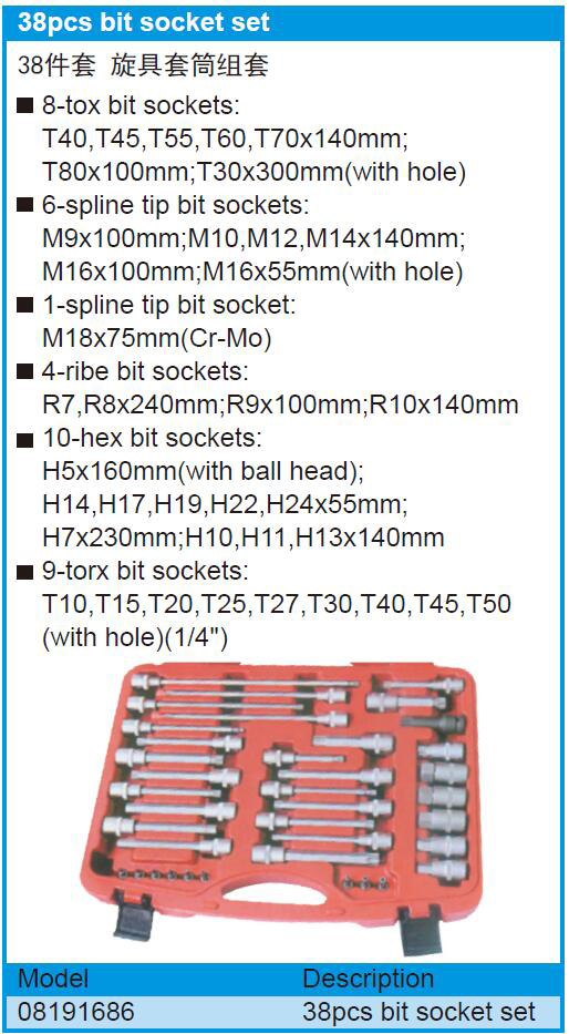 8孔位插座: T40 T45 T55 T60 T70×140mm; T80×100mm; T30×300mm(带孔) 6花键尖头套筒: M9×100mm; M10 M12 M14×140mm M16×100mm M16×55mm(带孔) 1花键尖头套筒: M18×75mm(铬钼) 4齿位套筒: R7 R8×240mm; R9×100mm; R10×140mm 10进制位插槽: H5×160mm(带球头) H14 H17 H19 H22 H24×55mm H7×230mm; H10 H11 H
