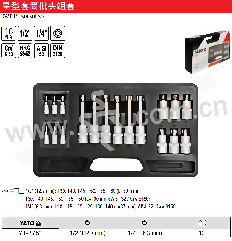 YATO/易尔拓 1/4"×1/2"星型套筒批头组套 YT-7751 18件 T10-T60 1套