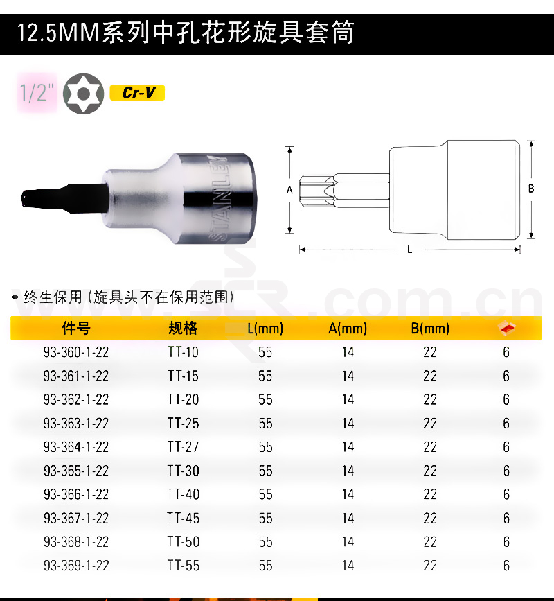 STANLEY/史丹利 12.5mm系列中孔花形旋具套筒 93-361-1-22 1个